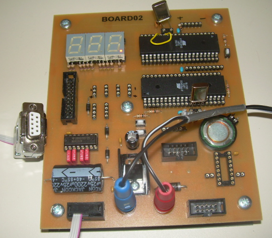 Bild 0-3: Testboard nach Übertragen des Deaktivierungsprogramms auf den oberen Mikrocontroller mit angeschlossenem RS232-Verbindungskabel mit D-Sub9-Stecker zum Anschluß an die COM-Buchse eines PCs.